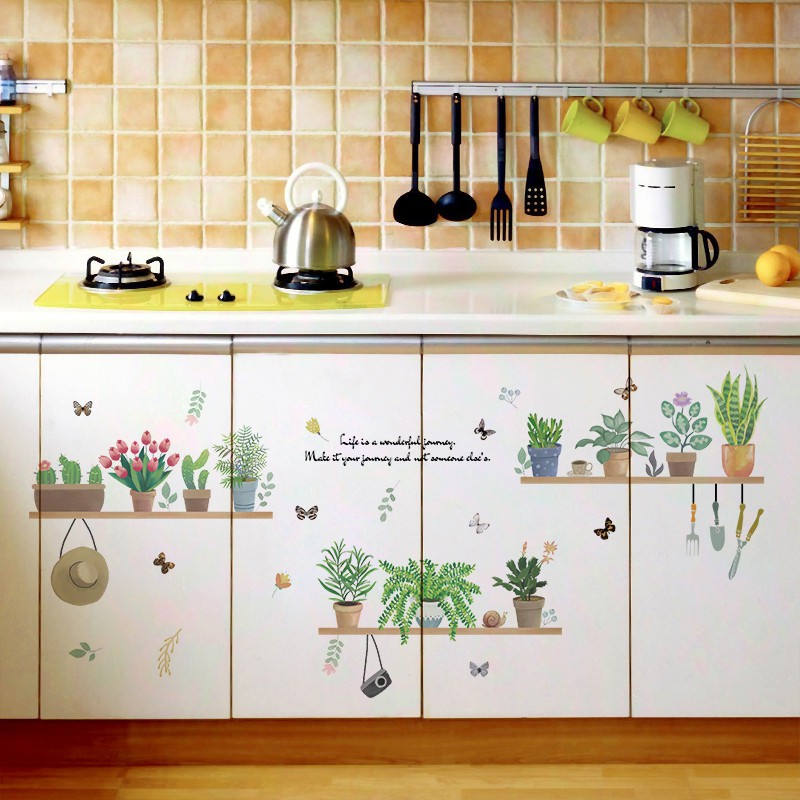 Diy Green Plants Wall Stickers Potted Flower Pot Butterfly Kitchen